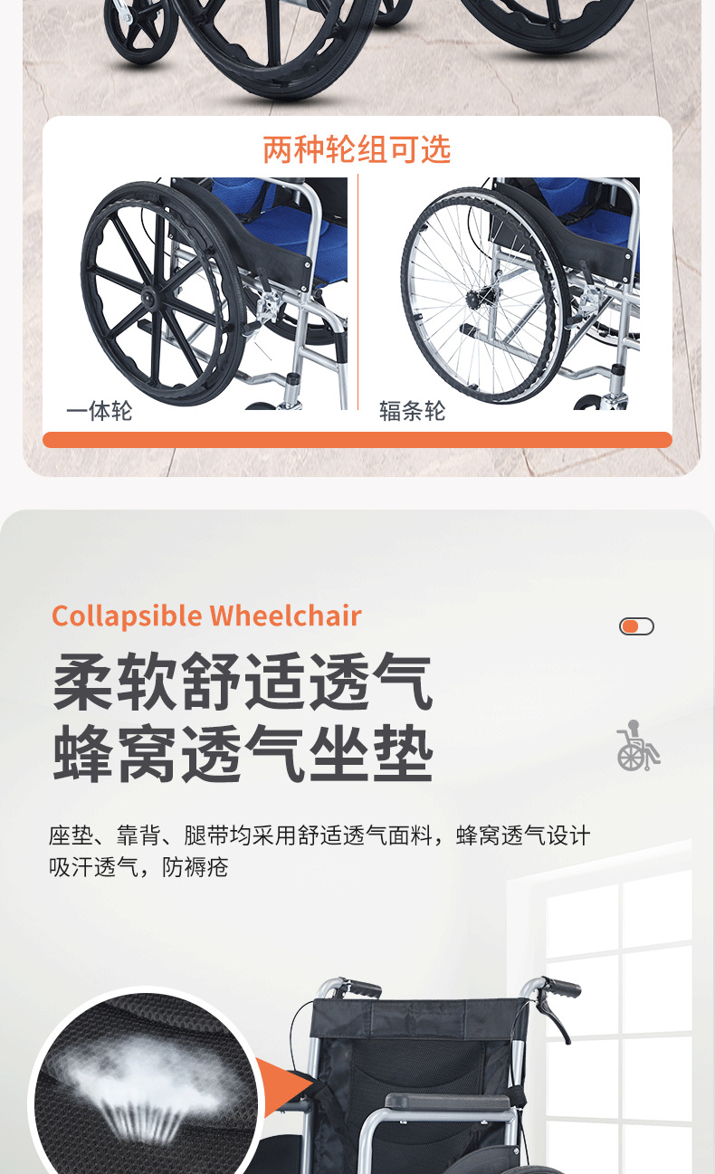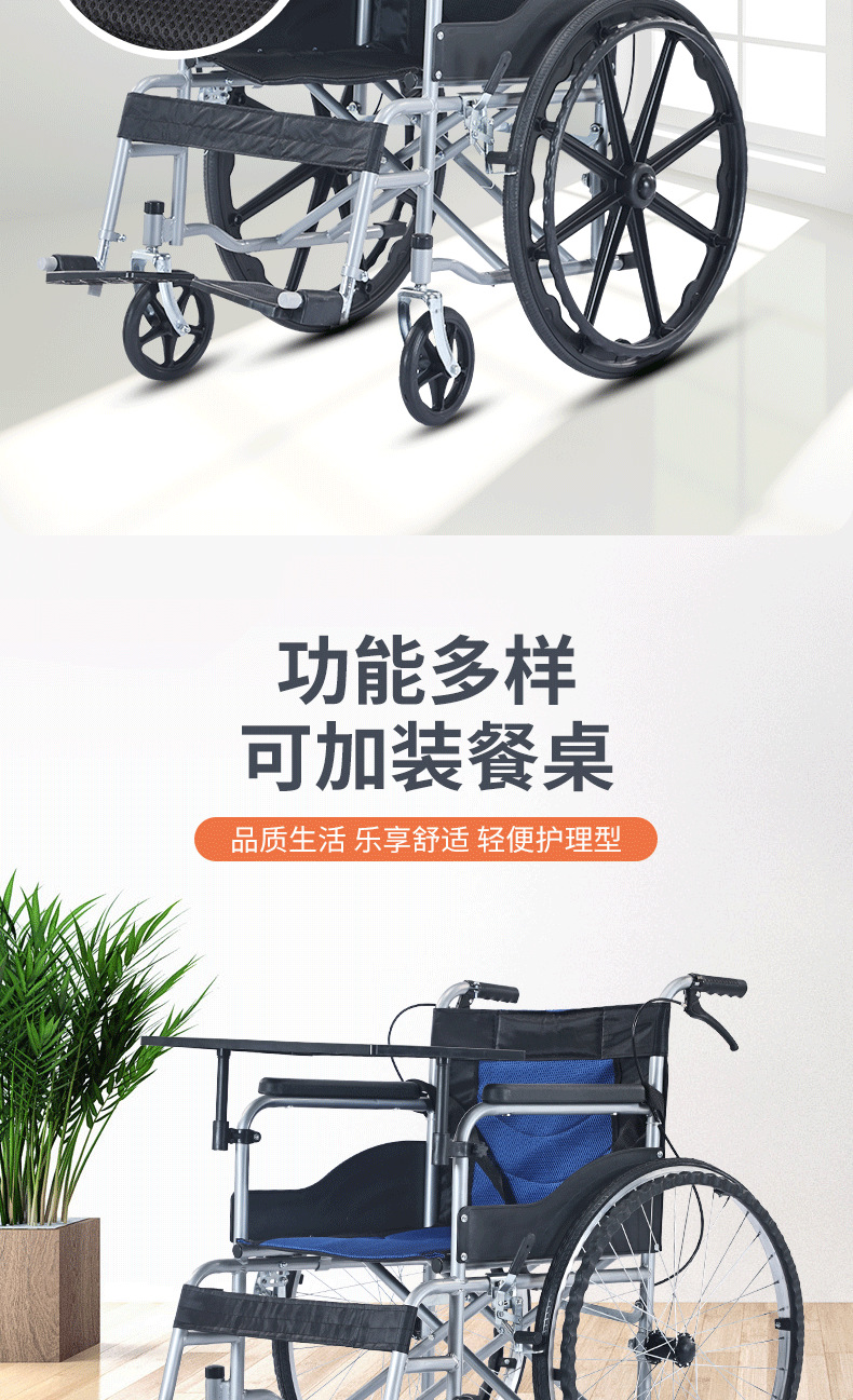 轮椅采用轻量化铝合金材质,兼顾强度与便携性;高弹软座搭配透气靠背,久坐不累,一键折叠设计轻松收纳,适配居家、就医、户外等多场景。配备防滑轮、安全带及可调节脚踏,安全性与舒适性兼备。
