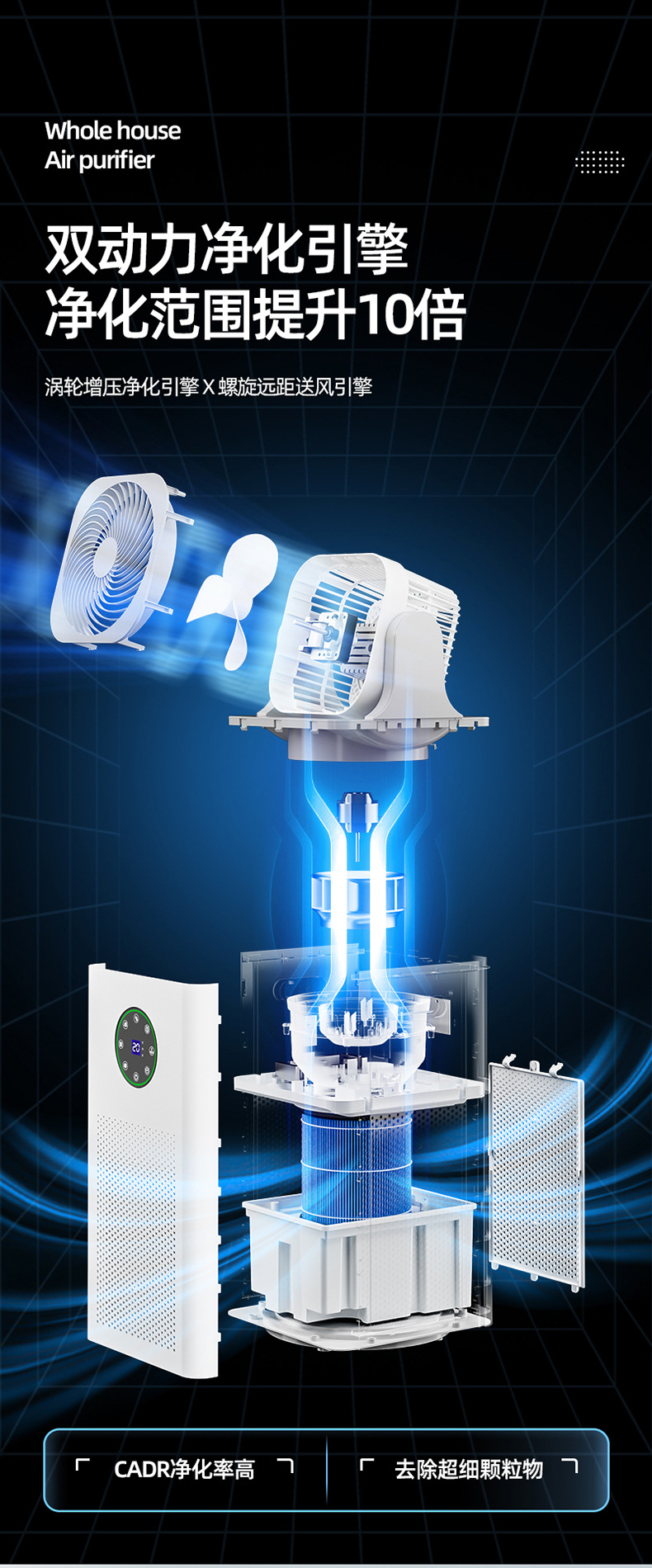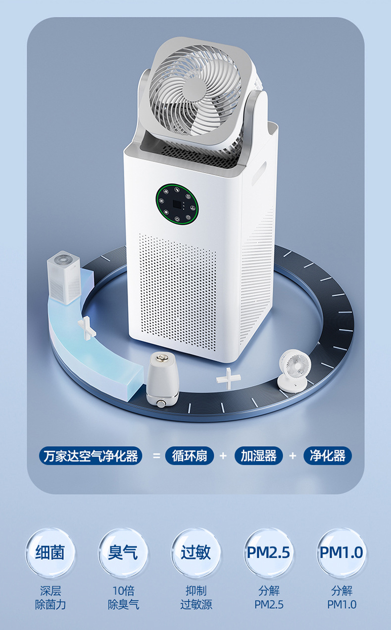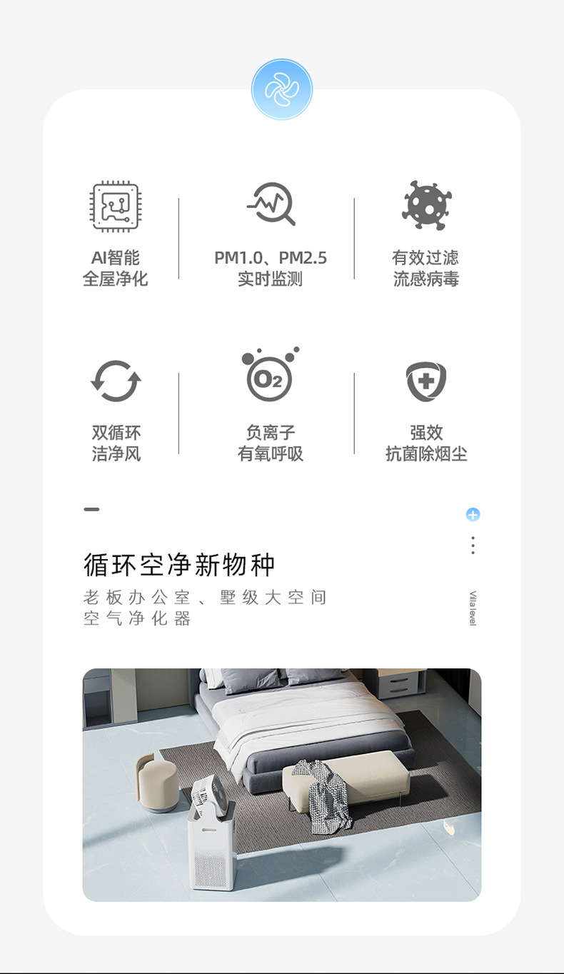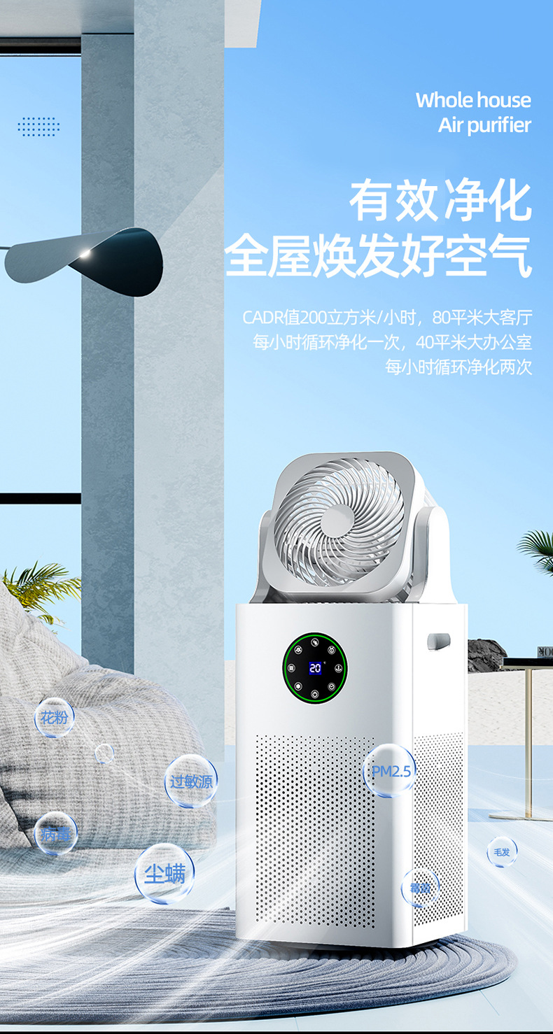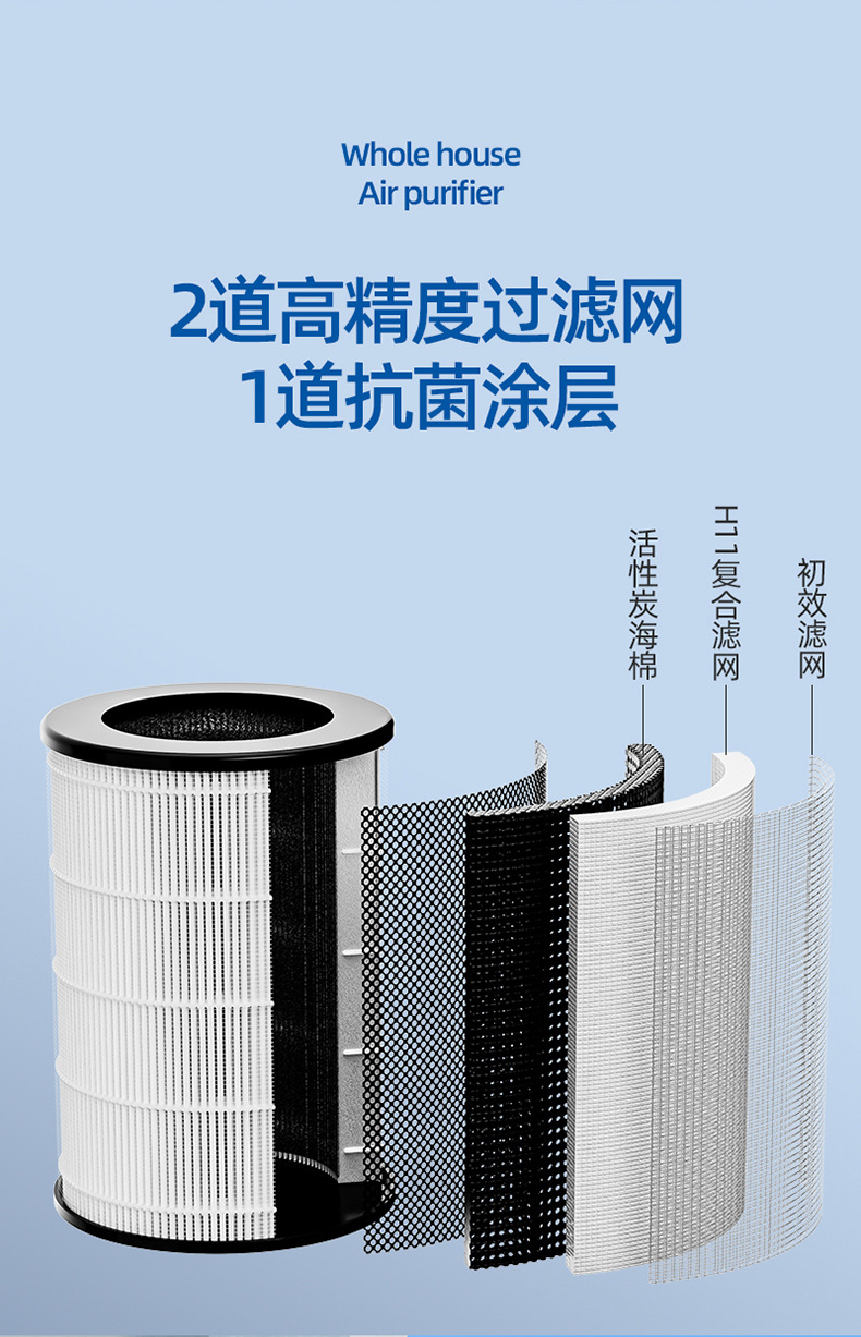 四重净化:HEPA+活性炭+UV杀菌+负离子技术,高效清除PM2.5、病菌及甲醛,净化效率≥99.9%;