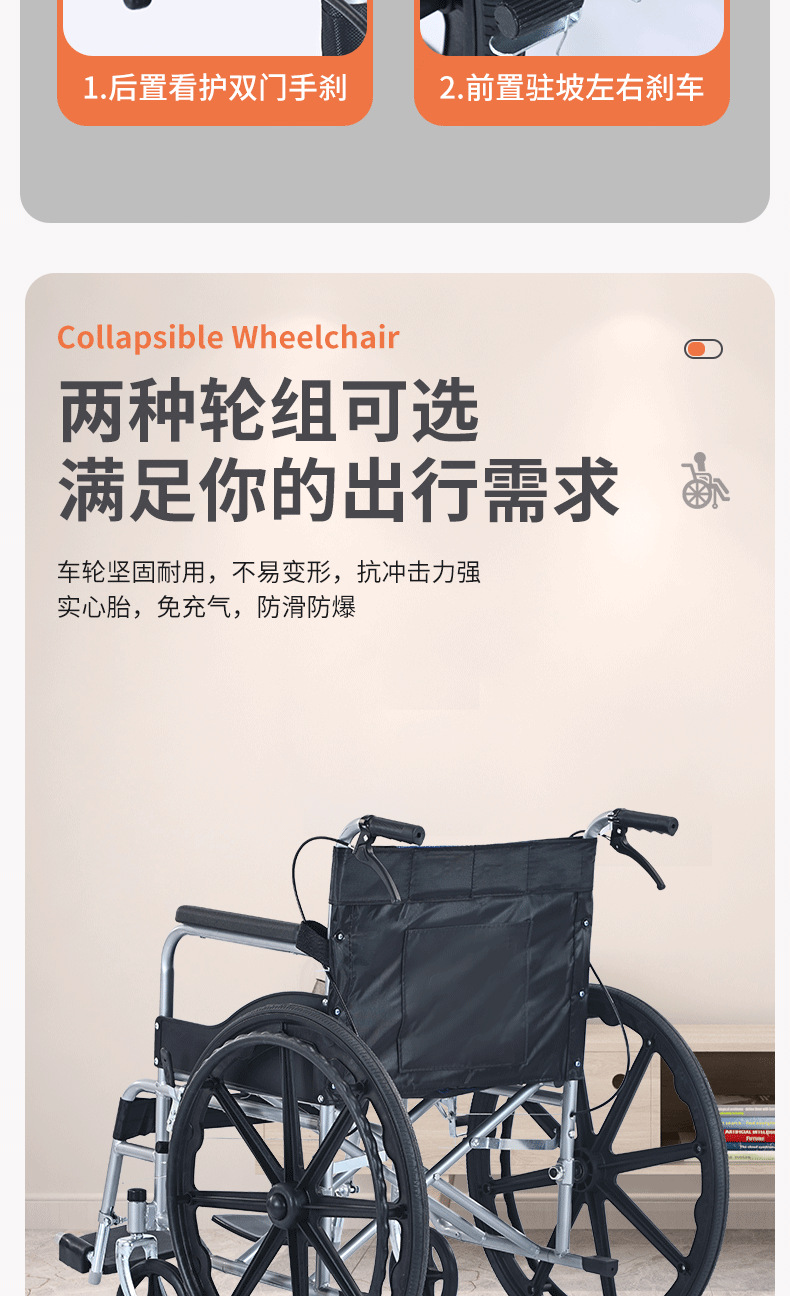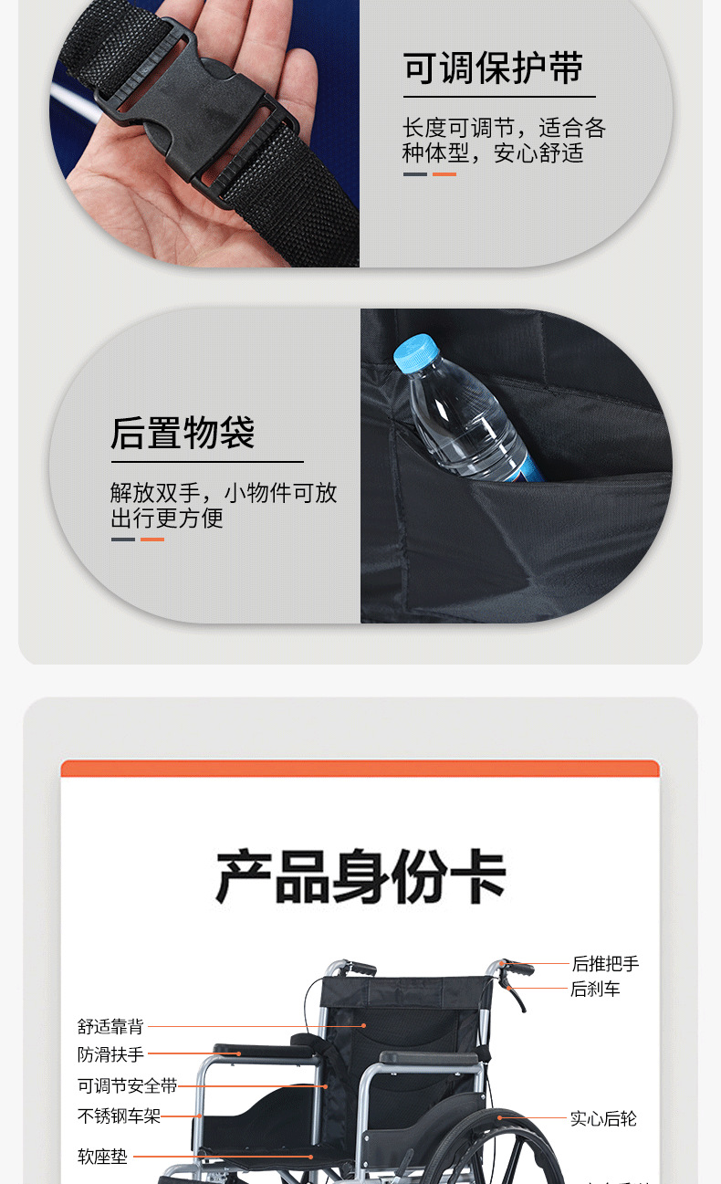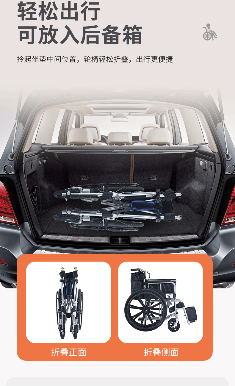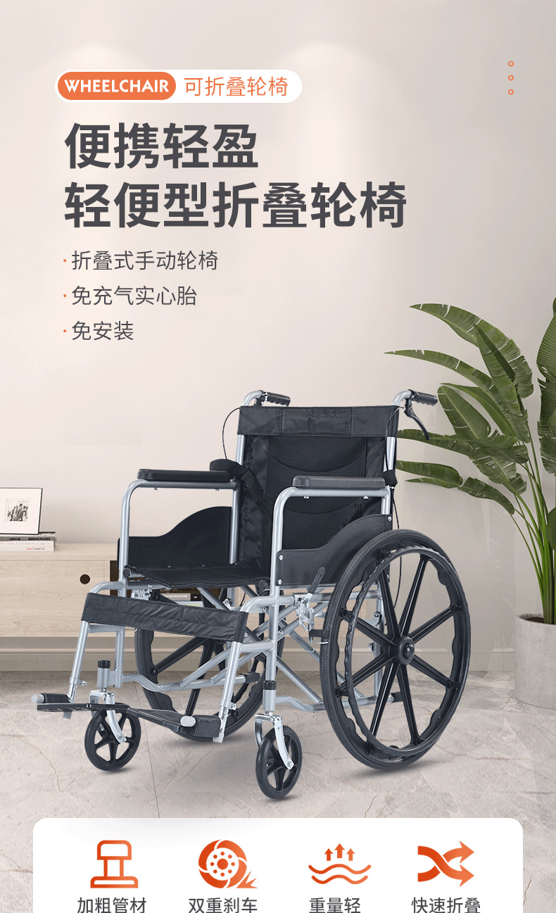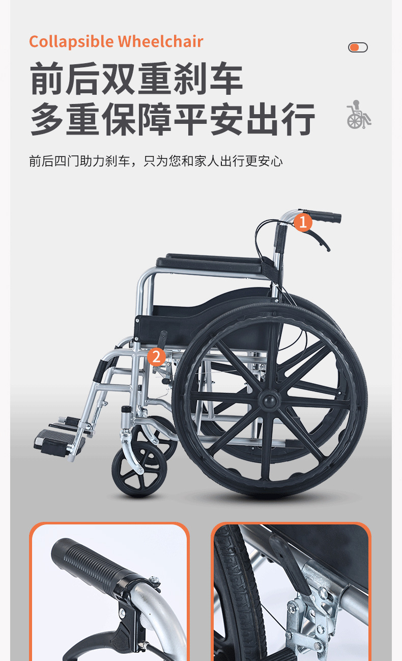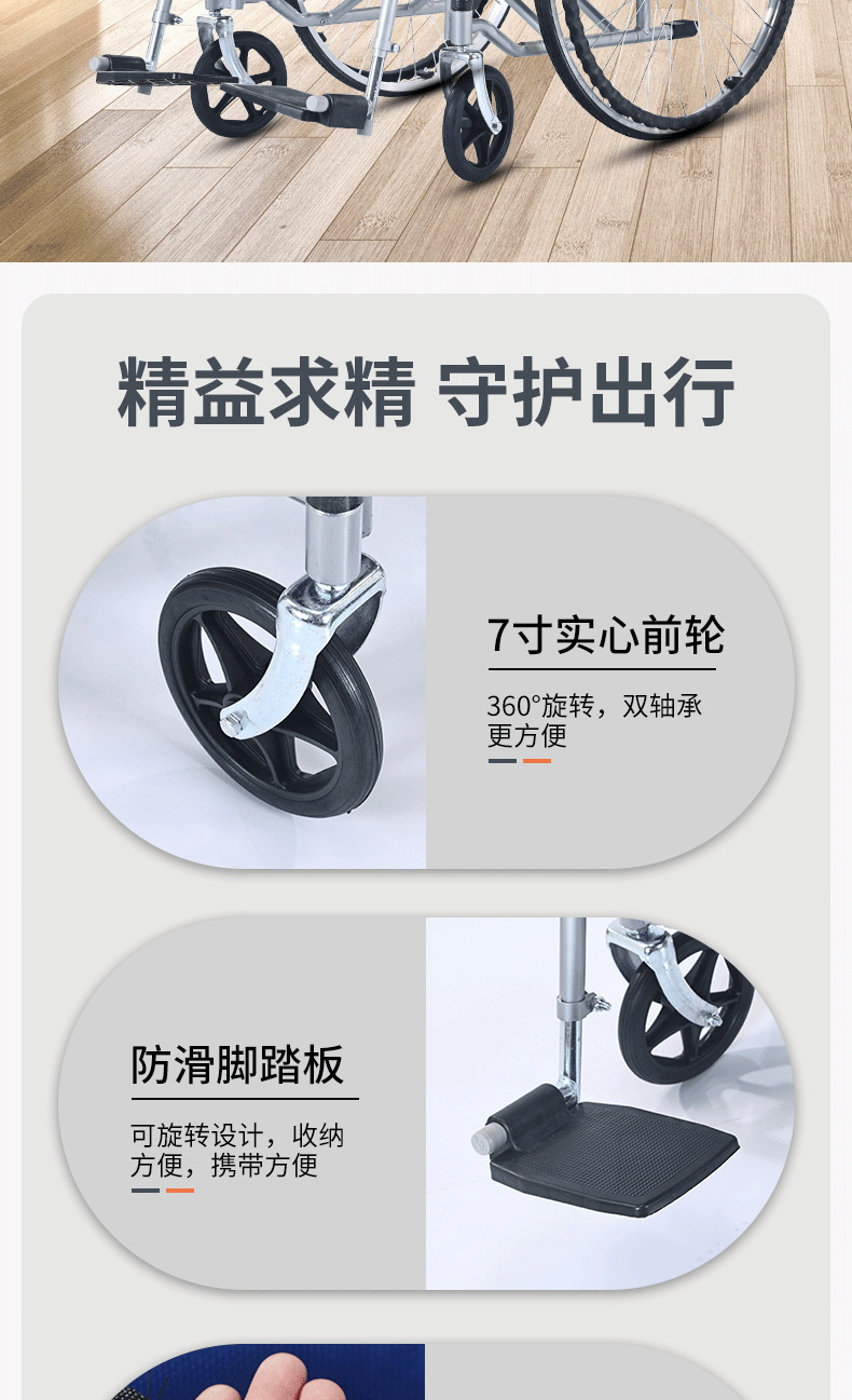 轮椅采用轻量化铝合金材质,兼顾强度与便携性;高弹软座搭配透气靠背,久坐不累,一键折叠设计轻松收纳,适配居家、就医、户外等多场景。配备防滑轮、安全带及可调节脚踏,安全性与舒适性兼备。
